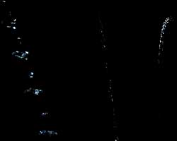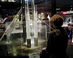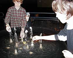 | Stroposkop vandstråler Tre vandstråler kan reguleres. Man kan tænde alm. lys og se hvordan de faktisk ser ud, men man fornøjes utrolig meget med effekten af stroposkop lyset, der fryser vandets bevægelse i slanger og dråber alt efter regulereringen af vandstrålerne og lamperne (særskilt lamperne til højre og til venstre). Rørende smukt, overraskende og fuldt af leg. Svært at fotografere! |
