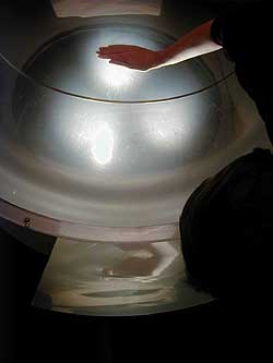 | Tør hånd i vand En glasskål med tre spejle under. Dyp hånden ned fra oven og kig i spejlet. Hånden ser helt tør ud. Fang nu en smule luft i hånden, se det virker som et klart spejl dernede i vandet! Børn er meget fascineret af denne opstilling. Også set andre steder. |