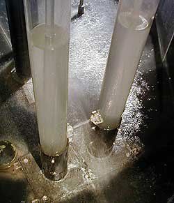 | Langsomme luftbobler Med en cykelpumpe pumper du bobler i væsken (nok glycerin) nedefra. Man kan se dem smelte sammen, hvis de bliver sendt afsted tæt nok på hinanden. Der var dog en del "forurening" i form af små bobler, der ligesom ikke kunne slippe ud af væsken. |