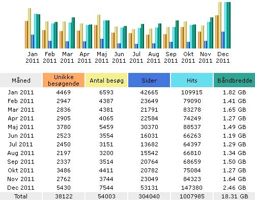 | Besøgstallet er i 2011 steget i forhold til 2010. 22.12. blev hacker-legen omtalt på dk4 med 4-doblet besøg som resultat. Det gav fx 610 besøgende på juleaftensdag. Siden med tips til nattoget er ellers hyppigst sete side. I årets løb blev den vist 3.859 gange. |
