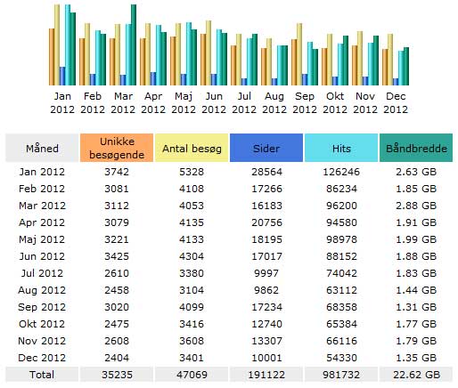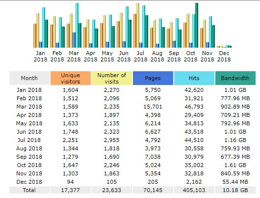 | 2018 blev et nogenlunde godt år for besøg på sitet. Over 2.000 unikke besøgende per måned skete dog kun i juli. Der er jo rigtig mange sider at fordele sig over, ofte direkte fra søgemaskinerne. Topscore er min side om nattog som er set 300 gange. Hackerlegen trækker ikke så meget mere, men artiklen om de store dyr i Alperne er stadig god. Der er stadig problemer med statistikprogrammet for december måned. |
