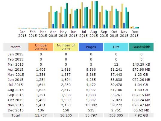 | Faldet i besøg er desværre fortsat i 2015. Statistikken mangler fire måneder (uvist hvorfor), men tendensen er klar. Udover hackerlegen, har en artikel om de store dyr i alperne trukket flest besøg (154 besøg). Schølers billedsamling på engelsk følger lige efter, ligesom min side "Jernbaner" og sagen om lukningen af nattog. Der er jo utrolig mange sider, og en stor bred fordeling af besøg. |