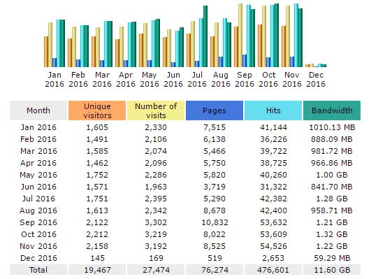 | 2016 blev et godt år for besøg på sitet. Med over 2.000 unikke besøgende per måned i hver af månederne september, oktober og november så er det udmærket. Hackerlegen trækker stadig pænt, men sider om de europæiske nattog topper sammen med artiklen om de store dyr i Alperne. Bemærk at december måned er glippet i statistikken. |