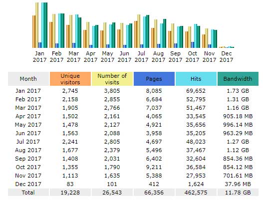 | 2017 blev et godt år for besøg på sitet. Med over 2.000 unikke besøgende per måned i en række måneder. Topscore er min side om hollandske NEMO, måske har der været et link et sted. Hackerlegen trækker stadig pænt, men sider om de europæiske nattog topper sammen med artiklen om de store dyr i Alperne ligesom sidste år. Der er stadig problemer med statistikprogrammet for december måned. |