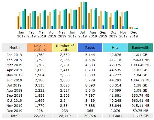 | 2019 blev et bedre år for besøg på sitet. Over 5.000 flere unikke besøgende end sidste år. Der er stadig rigtig mange sider at fordele sig over. Topscore er min side om nattog som er set knap 400 gange. Så kom en artikel om nattoget til Berlin. Hackerlegen trækker ikke så meget mere, men artiklen om de store dyr i Alperne er stadig god. Der er stadig problemer med statistikprogrammet for december måned. Det må vi bare se bort fra, man kan let regne sig frem til årets besøg ved at tro at december er nognelunde ligesom november. |